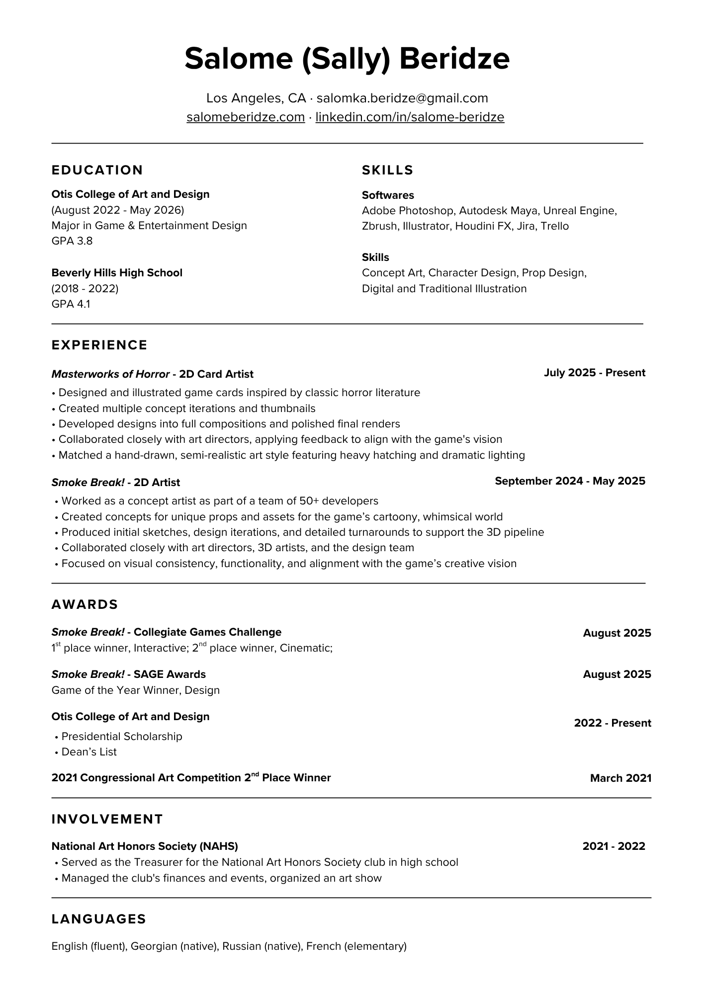 Sally (Salome) Beridze is a concept artist & illustrator specializing in character design for video games. She has a strong foundation in digital illustration and traditional fine arts. She has experience working as a 2D/concept artist on shipped indie game projects and collaborating with large development teams.