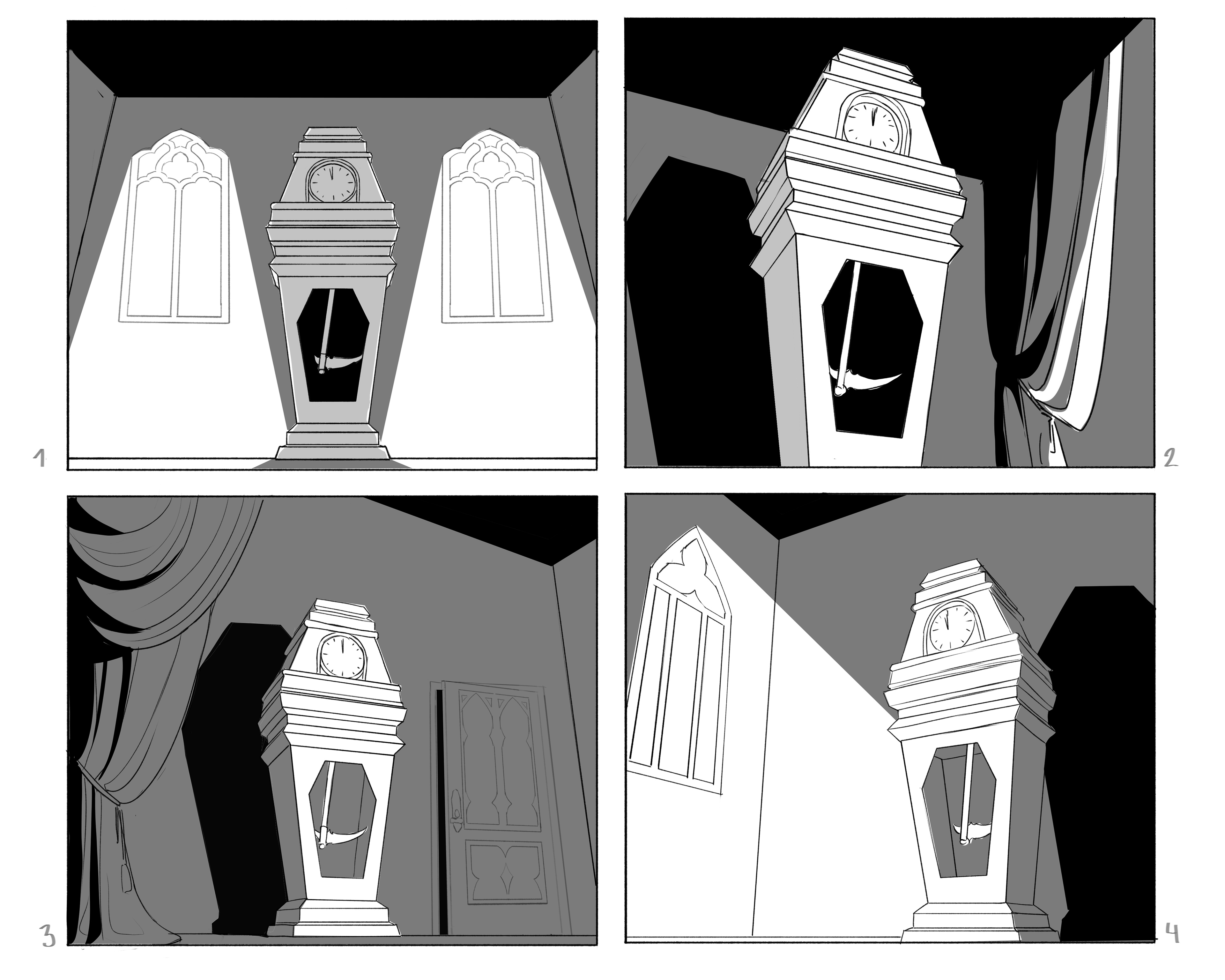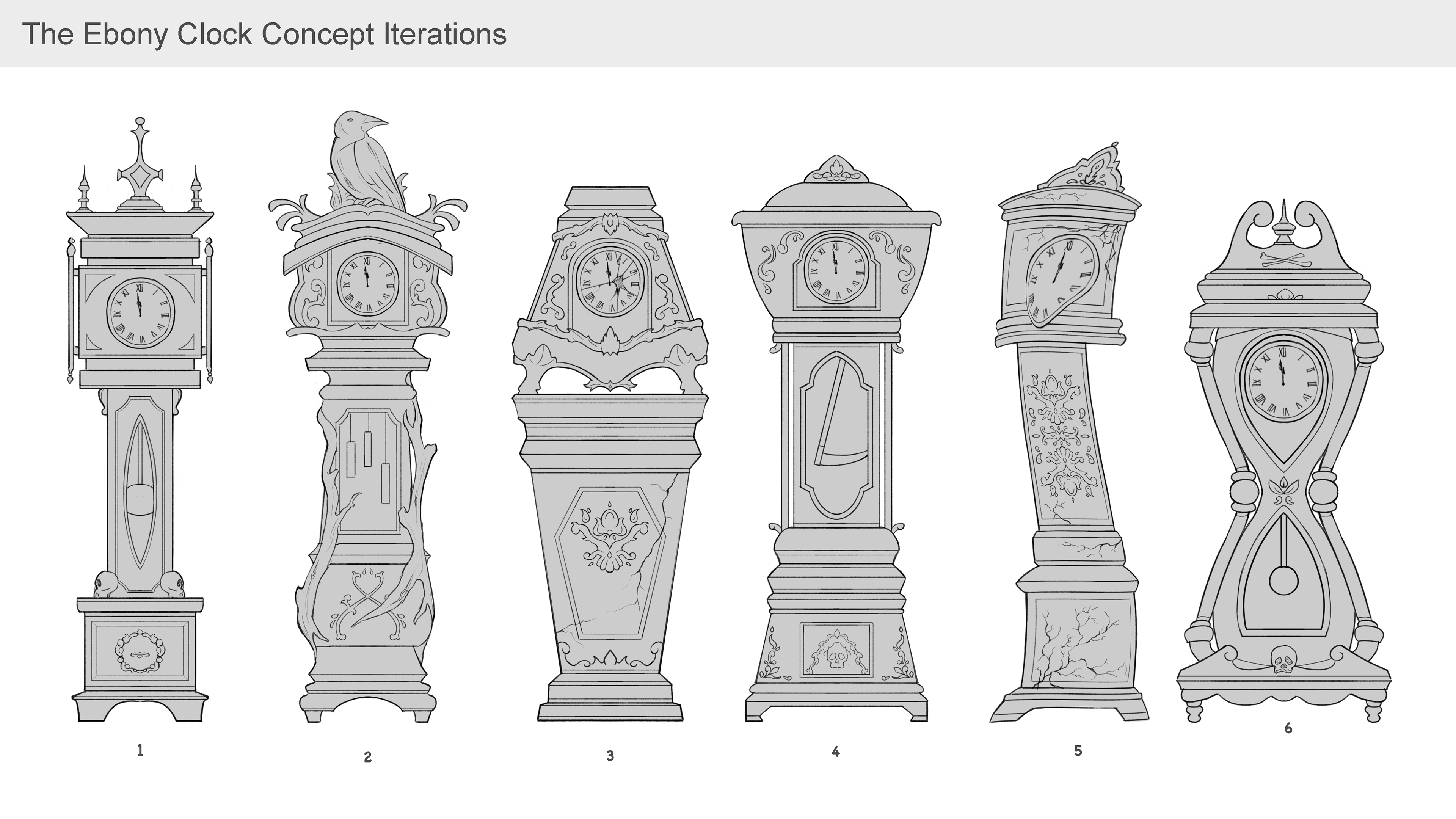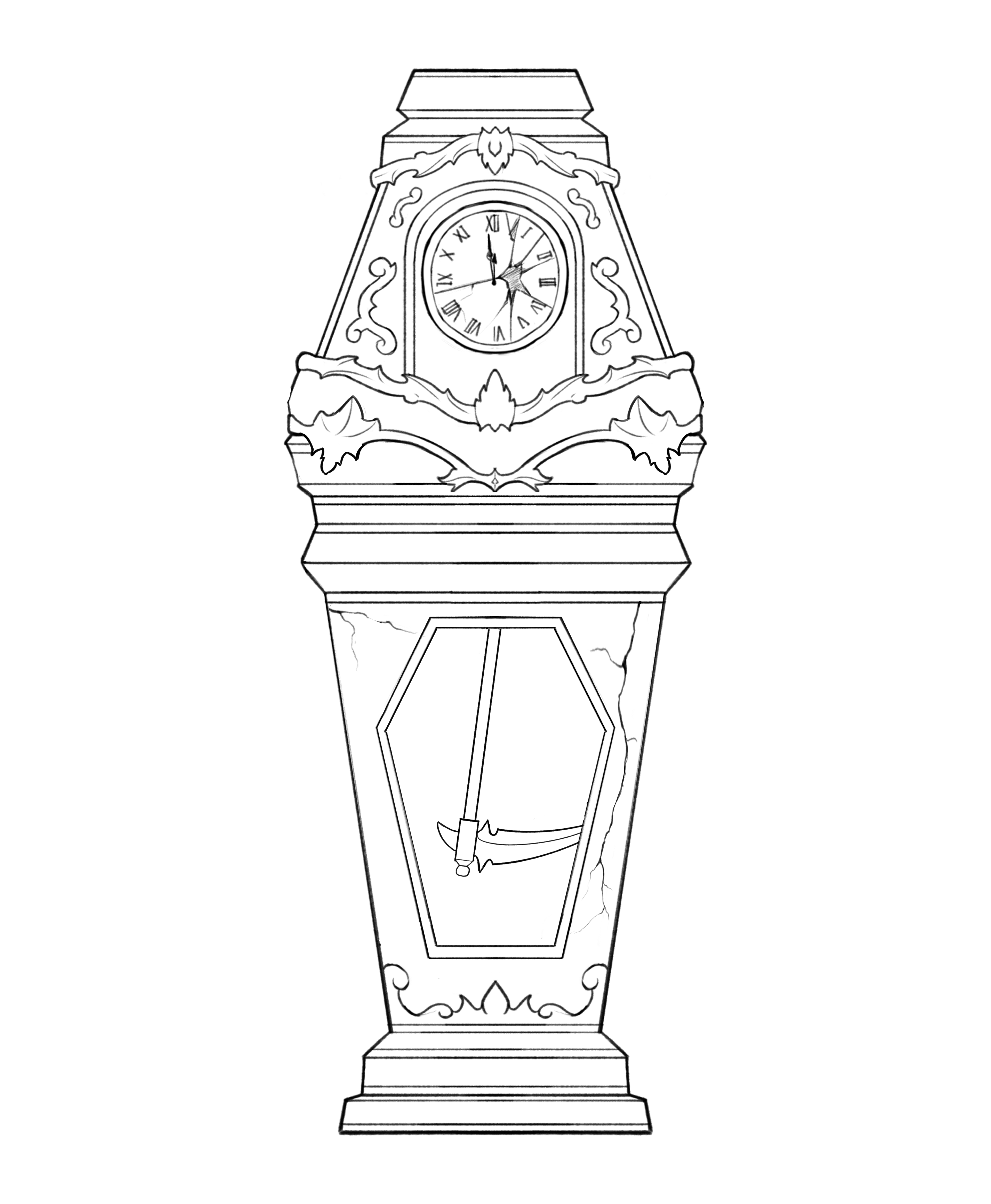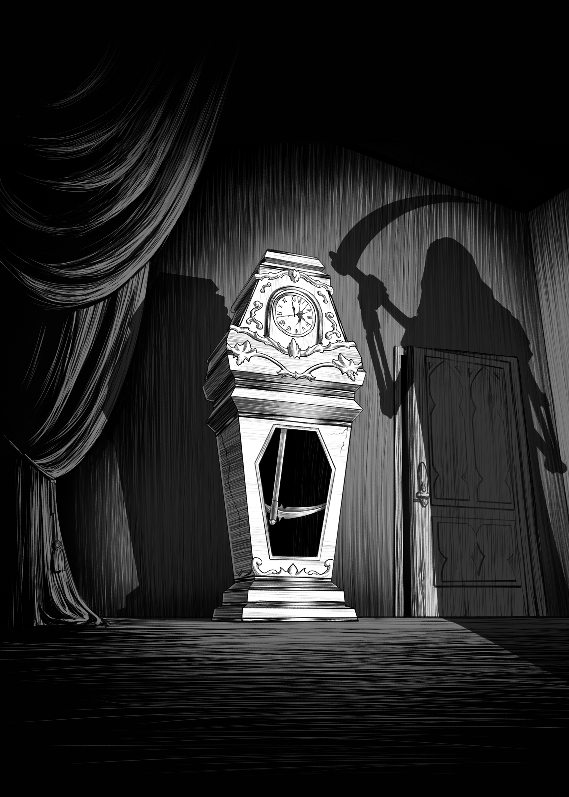 Ebony Clock - A prop card illustration based on The Masque of the Red Death by Edgar Allan Poe. The clock represents the passage of time and looming death, with dark ornate details emphasizing its ominous presence.