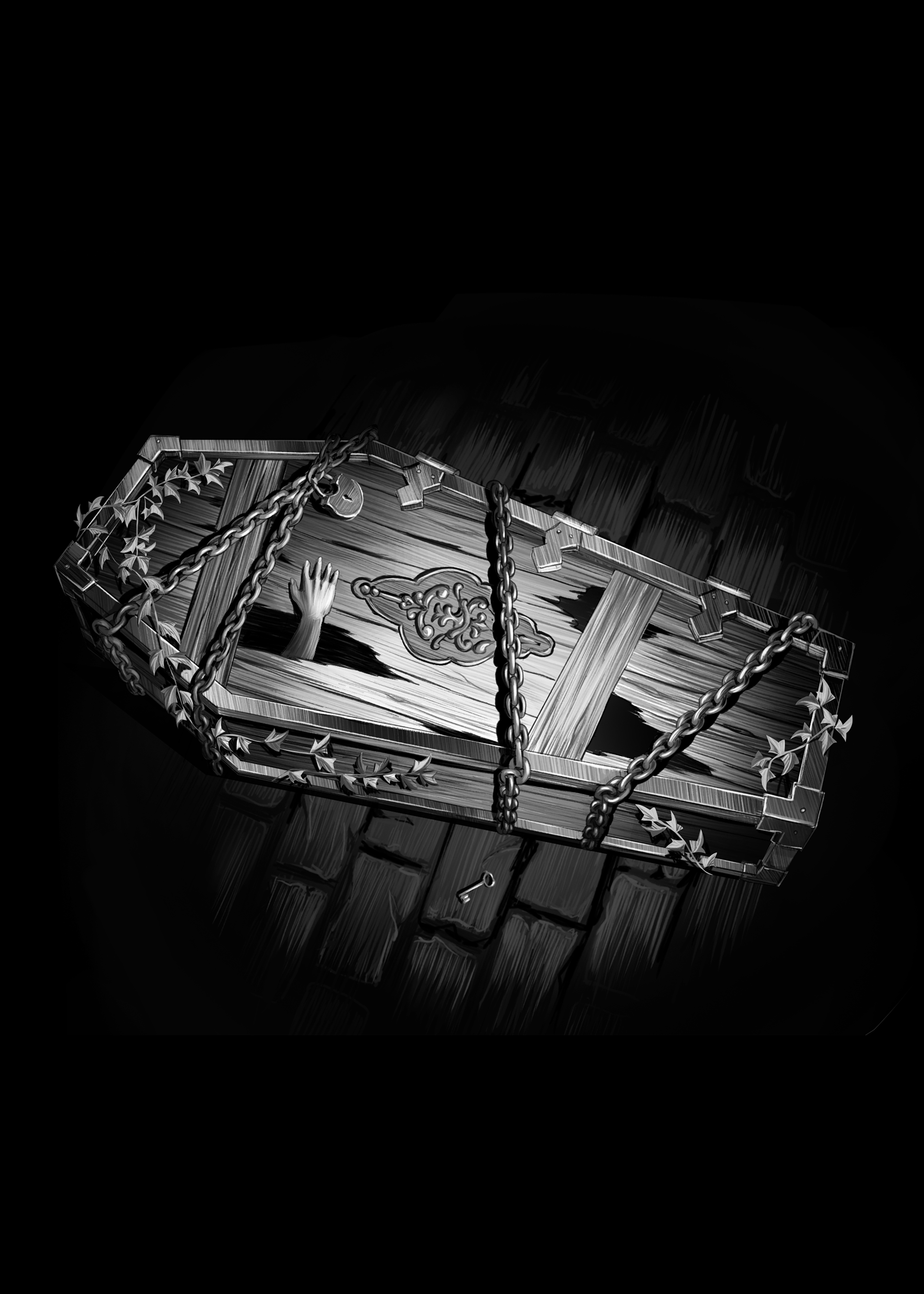 Madeline’s Coffin - A prop card illustration from The Fall of the House of Usher. The coffin captures the gothic and tragic tone of Madeline Usher’s entombment, with delicate details hinting at both beauty and decay.